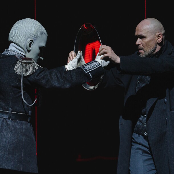 Однажды Арбенин дарит любимой жене браслет. И это красивый жест приводит возлюбленных к трагедии: герой теряет разум и жену. И лишь немые свидетели в масках молча наблюдают за происходящим.